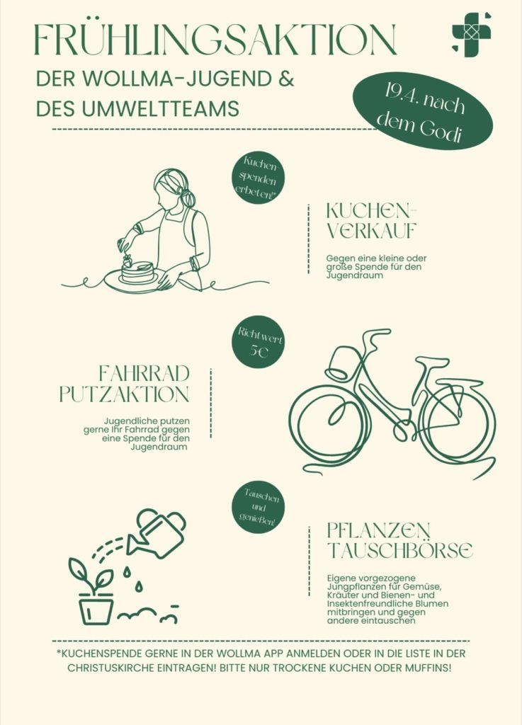 Am Sonntag, 19. April laden der Kinder- und Jugendausschuss und das Umweltteam zur Frühlingsaktion ein. Anschließend an den Gottesdienst, etwa ab 11 Uhr. Neben der Fahrradputzaktion und der Pflanzentauschböse wird es einen Kuchenverkauf geben.